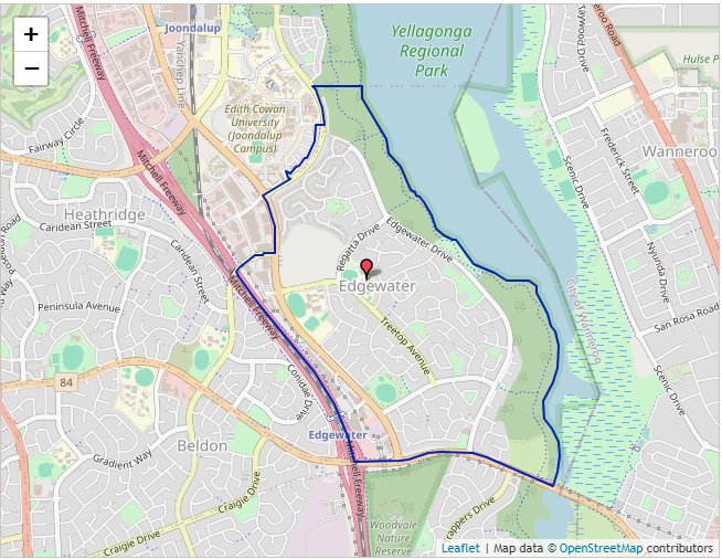 From the intersection of the Mitchell Freeway and Ocean Reef Road, in a general easterly direction along Ocean Reef Road (north side included) to Lake Joondalup, north and northwest along the western shore of Lake Joondalup to the locality boundary of Edgewater and Joondalup (that is, approximately due west of the northern-most point of Lake Island), west from this point to Lakeside Drive, south and southwest along Lakeside Drive (both sides included) to Joondalup Drive, south along Joondalup Drive (east side included) to Eddystone Avenue, southwest along Eddystone Avenue (south side included) to the Mitchell Freeway, and in a general southeasterly direction along the Mitchell Freeway (east side included) to Ocean Reef Road